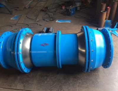 三維球形補償器由兩個球形結(jié)構(gòu)元件和一個套筒結(jié)構(gòu)元件所組成。球形結(jié)構(gòu)元件作徑向撓曲的角向位移,套筒結(jié)構(gòu)元件作軸向的線位移。本球形結(jié)構(gòu)元件和套筒結(jié)構(gòu)元件均可以獨立安裝。獨立安裝時,球形結(jié)構(gòu)元件能解決管道彎曲補償,套筒結(jié)構(gòu)元件能解決管道軸向伸縮補償。當(dāng)兩個球形結(jié)構(gòu)元件和一個套筒結(jié)構(gòu)元件組合時,形成能同時吸收三維膨脹量的肘節(jié)結(jié)構(gòu)。